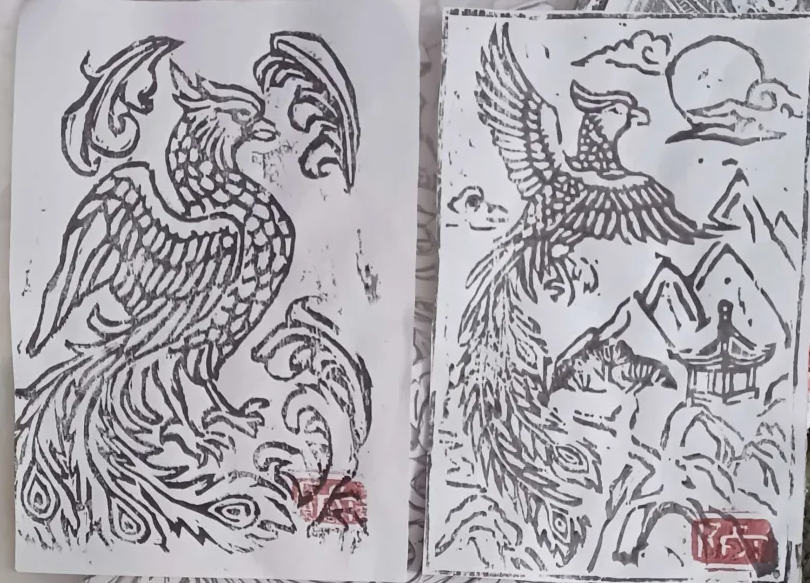 These were my first 2 wood blocks ever carved and includes 2 prints, both phoenix motifs.